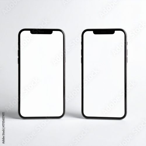 Two modern smartphones displaying blank white screens stand sidebyside on a clean white surface, ready for content insertion in a minimalist and contemporary style.