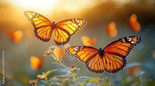 Two Monarch butterflies perched on a plant at sunset, backlit with warm golden light, showcasing vibrant colors and intricate wing details.