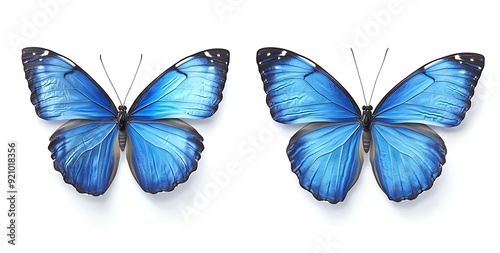 Two Morpho butterflies with vibrant blue wings isolated on white background.