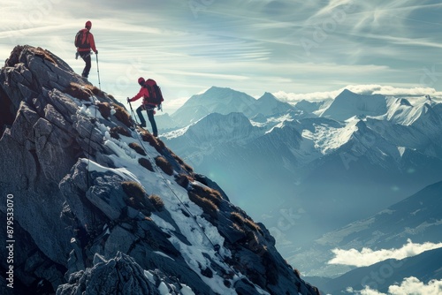 mountain, climbing, climber, climber, snow, snowy, ridge, vale, adventure, teamwork, challenge, achievement, success, determination, perseverance, inspiration, motivation, goal, peak, summit, cloud, sky, landscape, nature, sport, extreme, hiking, trekking, mountaineering, active, lifestyle, travel, expedition, winter, cold, ice, rope, safety, gear, equipment, friends, partnership, sunlight, sun, bright, scenic, breathtaking