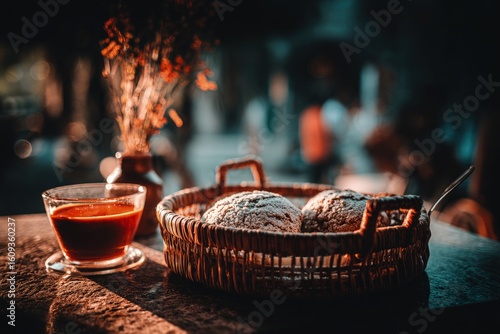 muffin, bread, basket, hot drink, drink, beverage, glasses, flower, dried flowers, rustic, still life, food, dessert, baked goods, cafes, eatery, table, surface, textured, dark, moody, low key, lighting, warm tones, shadow, blur, bokeh, closeup, indoor, wicker, spoon, vintage, breakfast, afternoon tea, culinary, bakery