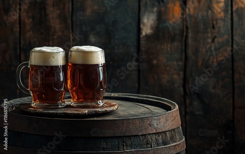 Two mugs of beer on an old wooden barrel, rustic pub or tavern setting