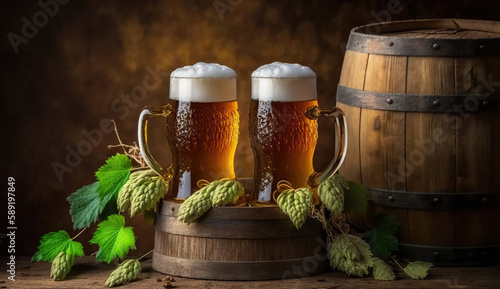 Two mugs of lager beer with hops on wooden background. Based on Generative AI