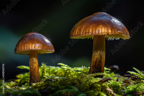Two mushrooms growing amidst green moss, illuminated by natural light
