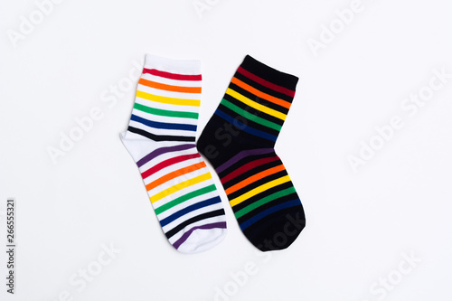Two negative socks with striped pattern on white background. Clothes for feet with black and white textile. Copy space