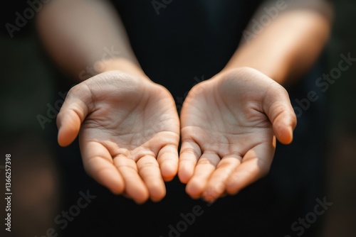 hand, open, palm, skin, gesture, receiving, offering, giving, empty, cupped, finger, nail, wrinkle, texture, detail, light, shadow, foreground, background, dark, soft, warm, care, hope, help, support, kindness, charity, donation, share, trust, faith, belief, prayer, grace