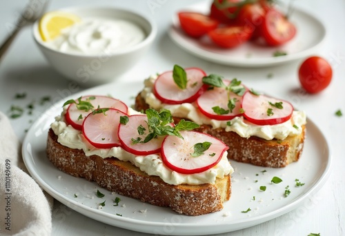 Two open-faced sandwiches with cream cheese, radish slices, and fresh herbs on a white plate