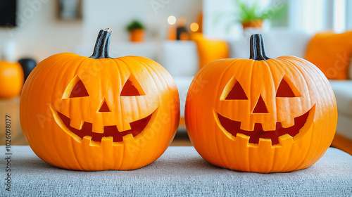 Two orange pumpkins with smiling faces on them. Scene is cheerful and festive, as it is a representation of Halloween