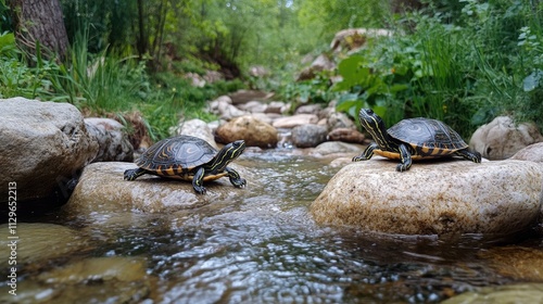 turtle, reptile, stream, river, nature, wildlife, basking, rock, water, environment, sunlight, aquatic, fresh water, amphibian, shell, wild, fauna, ecosystem, outdoors, summer, green, colours, vibrant, peaceful, scenic, landscape, beauty, harmony, animal, herpetology, biodiversity