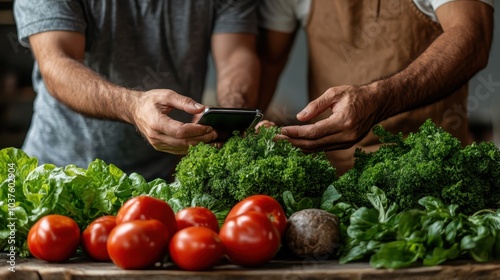 Two pairs of hands are busy arranging various fresh vegetables, including tomatoes and greens, on a wooden table. Their focus is on culinary preparation and creativity.