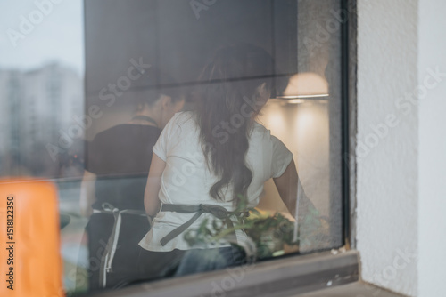 Two people, captured from outside a window, collaborating in a kitchen to prepare a meal, creating a welcoming and harmonious scene in an intimate home setting.