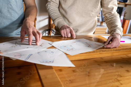 Two people reviewing architectural sketches on a wooden table. Nijmegen, Netherlands