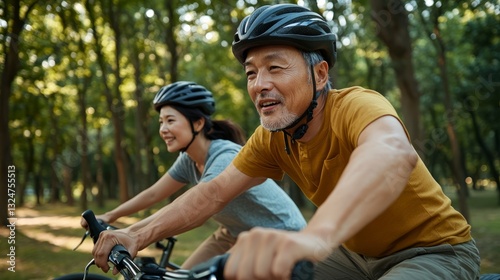 horizontal, portrait, middle-aged, couple, man, woman, cycling, bicycle, park, nature, adventure, happiness, smiling, togetherness, love, bonding, exercise, greenery, sunlight, summer, holiday, vacation, travel, freedom, fun, leisure, relaxation, joy, scenic, healthy lifestyle, wellness, friendship, romantic, energetic, carefree, cheerful, weekend, recreation, motion, activity, sport, environment, scenic route, countryside, family, retired
