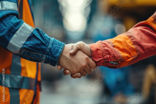 2, people, shake, hand, warehouse, business, deal, agreements, partnership, teamwork, collaboration, industry, men at work, employee, attire, red, shirt, blue, hat, handshake, greeting, meeting, negotiation, contract, cooperation, trade, commerce, indoor, industrial, professional, factory, work, team, shaking, partner, cooperative, colleague, workplace, collar, trust, successful, corporate, businessman, discussing