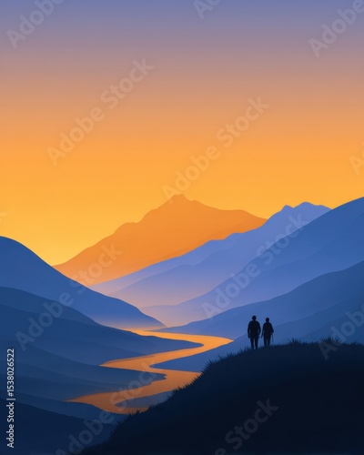 mountain, landscape, nature, hiking, outdoors, vista, scenic, exploration, adventure, travel, sunset, river, vale, silhouette, people, hill, view, calmness, peace, serenity, leisure, recreation, tour tourism, journey, wanderlust, freedom, escape, distance, far, minimalism, illustration