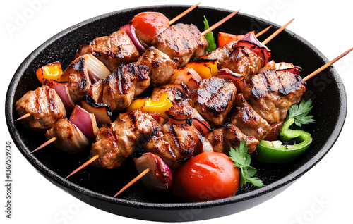 Two photos of shish kebabs in a pan, isolated on a transparent background