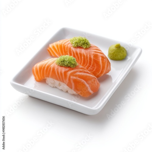 Two pieces of salmon sushi (nigiri) with wasabi, placed on a small white dish, isolated on pure white background