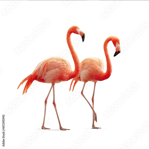 Two pink flamingos fullbodied standing on two legs looking sideways against a pure white background captured in highdefinition photography with highresolution