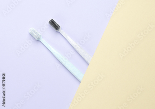 Two plastic toothbrushes on a pastel background. Oral hygiene
