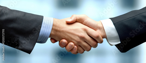 Two professionals, dressed in formal suits, engage in a firm handshake, symbolizing agreement and partnership, inside a contemporary office space during daylight.
