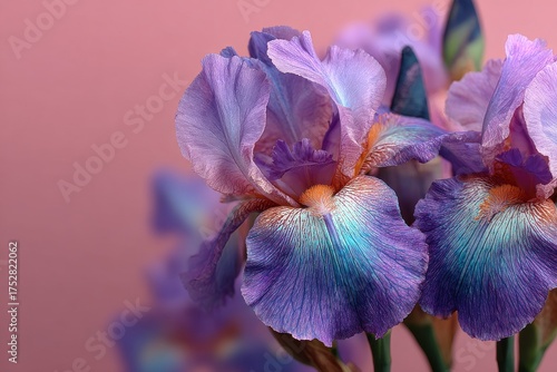 Two purple Iris flowers blooming with water droplets against a soft pink background, creating a serene and elegant floral scene