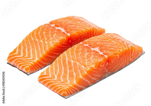 Two raw salmon steaks isolated on white background, side view, no depth of field, sharp.
