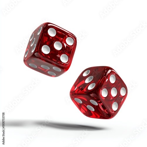 Two red dice rolling against a white isolated background, showcasing chance and excitement in games.