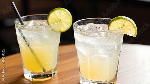 cocktail, drink, beverage, refreshment, lime, citrous, ice, glasses, liquid, clear, yellow, green, straw, condensation, alcohol, bar, pub, eatery, party, celebration, summer, vacation, thirst, cool, refreshing