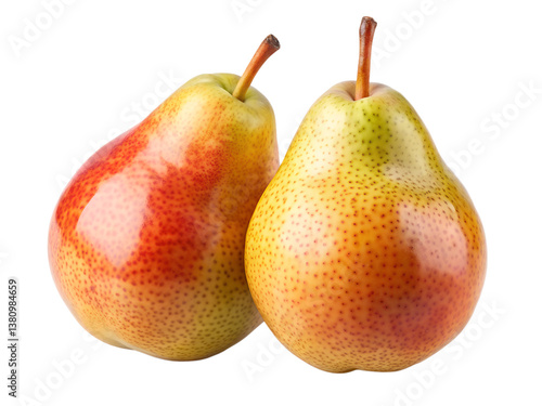 Two ripe, juicy pears glistening with a sun-kissed blush, showcasing their vibrant red and yellow hues against a crisp white background.
