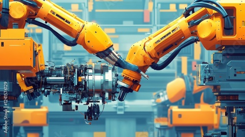 Two robotic arms collaborate in a factory setting, handling a mechanical component amidst a backdrop of industrial machinery.