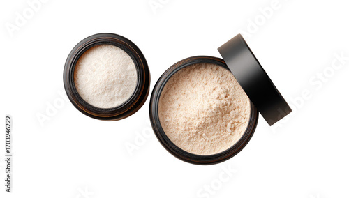 Two round, open cosmetic powder jars. Light tan/beige powder fills each jar. Black lids. High angle, studio shot