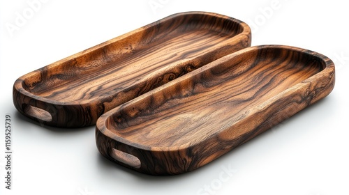 Two rustic, oblong wooden serving trays with handles, isolated on white.