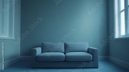 sofa, couch, furniture, interior, design, room, wall, blue, window, cushion, seat, home, modern, living, studio, house, carpet, minimal, contemporary, apartment, nobody, architecture, indoor, simple, grey, light, clean, plain, style, minimalism, relaxation, space, empty, comfortable, decor, neutral, textile, fabric, residential, window sill, property, daytime, daylight, monochromatic, serene, to rest, residence, habitation