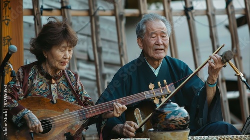 Two senior musicians play traditional instruments, captivating the audience with their melodies at a lively cultural festival