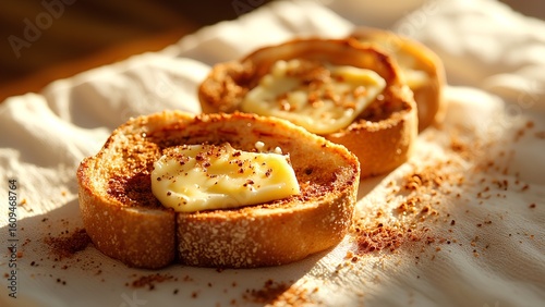 Two slices of toasted bread topped with melting butter and sprinkled with spices, resting on a textured cloth in warm natural light.