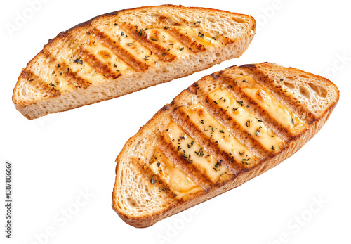 Two slices of toasted bread with melted cheese and herbs sprinkled on top. The bread has grill marks, from toasting, isolated over transparent background, PNG cut-out