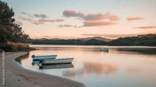 water, boat, beach, shore, lake, sea, sand, sky, cloud, sunset, sunrise, dusk, dawn, landscape, nature, calm, tranquil, quiet, serene, peaceful, coast, shoreline, bay, ocean, scenic, view, horizon, travel, vacation, tree, hill, mountain, adventure, boat, outdoors, evening, day, beautiful, gold, light, pretty, transport, vehicle