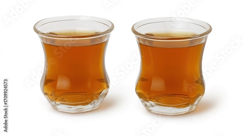 tea, cup, glasses, liquid, amber, brown, drink, hot, small, clear, transparent, pair, 2, beverage, still, isolated, white, background, studio, image, product, display, close, up, afternoon tea, turkish, eastern, asian, refreshment, warm, delicious, healthy, aromatic, nourishment, simple, elegant, porcelain, smooth, gold, bright