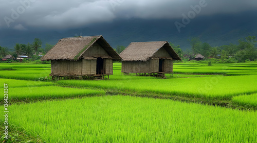 Two Small Huts with Thatched Roofs in a Bright Green Rice Paddy Field With Dark Mountainous Background Under Overcast Sky