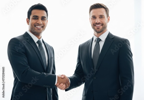 business, handshake, agreements, deal, partnership, collaboration, success, meeting, professional, man, suit, formal, wear, confidence, trust, greeting, introduction, teamwork, corporate, office, caucasian, indian, diverse, smiling, happy, positive, isolated, white, background, studio