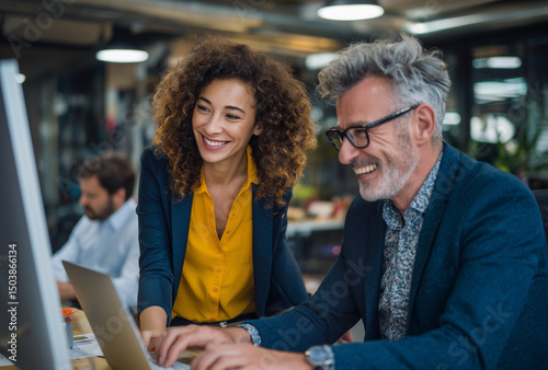 business, office, laptop, computer, working, teamwork, collaboration, technology, businessperson, colleague, project, happy, smiling, modern, communication, connection, success, professional, job, career, corporate, workplace, meeting, discussion, strategy, planning, analysis, design, creative, startup, entrepreneur, marketing, sale, finance, management, leadership, diversity, inclusion, female, male, adult, mature, desk, screen, keyboard