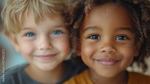Two Smiling Children with Diverse Features in Bright Indoor Setting