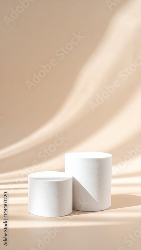 Two smooth, white cylindrical objects stand upright on a soft beige background, casting subtle shadows that enhance their sleek, modern appearance.