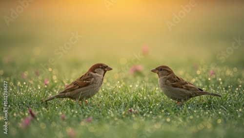 Two sparrows face each other in dewy grass.