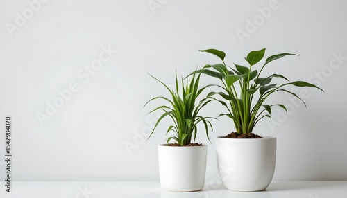 two spider plants in white pots on white background, bottom position with copy space at top, minimalist and serene vibe.