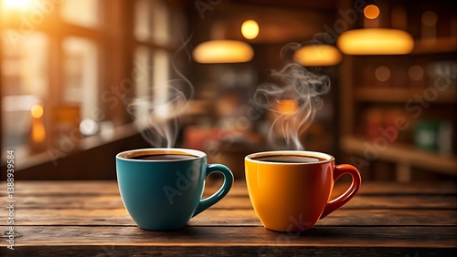 Two steaming coffee cups on a wooden table, symbolizing comfort, relaxation, and savoring simple moments. peaceful moment, good company,warm drink,comfort, connection,