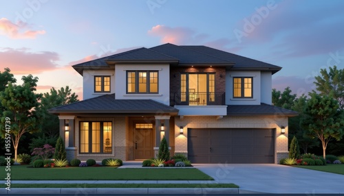 Two story house with attached garage illuminated windows and landscaped yard at dusk