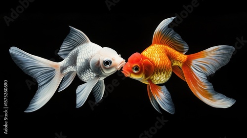 Two stylized goldfish, one white, one orange, face each other against a black backdrop