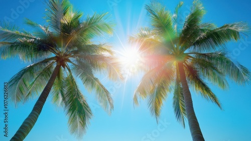 Two tall palm trees silhouetted against a bright blue sky and radiant sun, evoking a tropical paradise vibe.