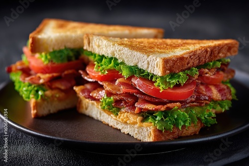 sandwich, bacon, lettuce, tomatoes, toast, food, delicious, tasty, grilled, ingredient, plate, meal, snack, lunch, dinner, american, comfort, classic, healthy, protein, carb, vegetarian, filling, homemade, prepared, slice, crispy, gold, brown, fresh, photo, close, up, appetising, dark, background